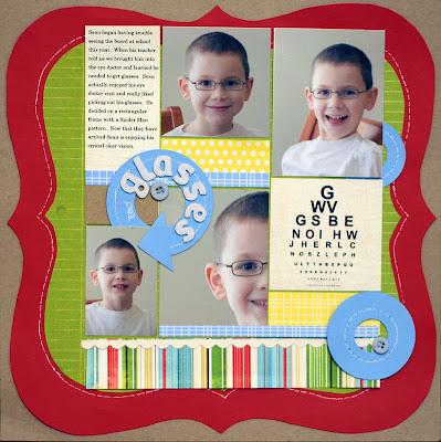 Up first is a page by Pam. This page really highlights the happiness in her sons face. It is really neat how she selected some close-up and some more full view photos. Pam is really great at using shapes on her pages. I love the way she has included 2 circles on the page, like the lenses of glasses! The blocked layout also looks awesome matted by the bracket shape.